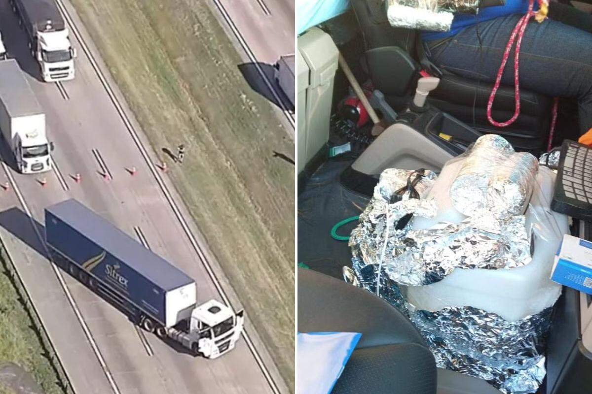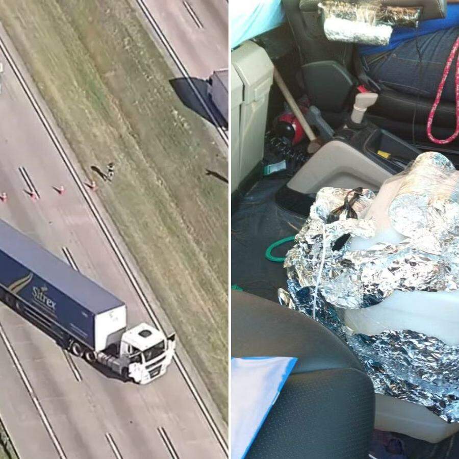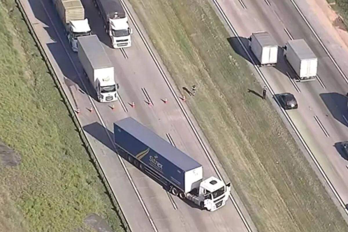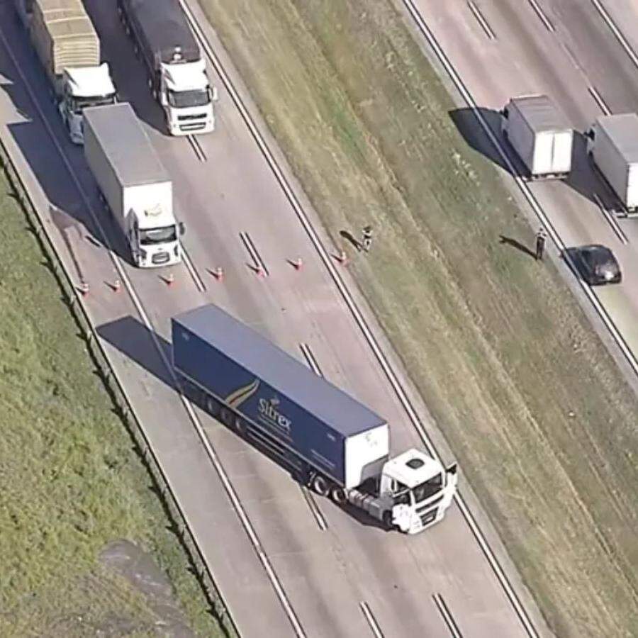 Polícia isolou área em Itapecerica da Serra (SP) após carreta atravessar a pista com possível artefato explosivo; motorista diz ter sido feito refém por criminosos