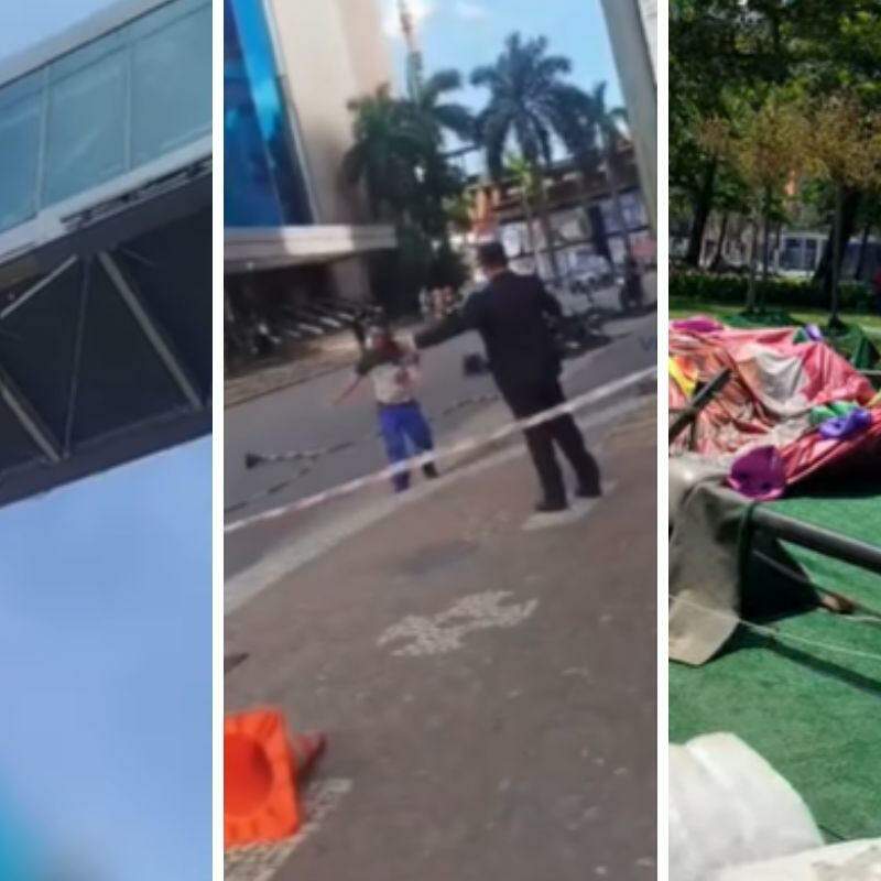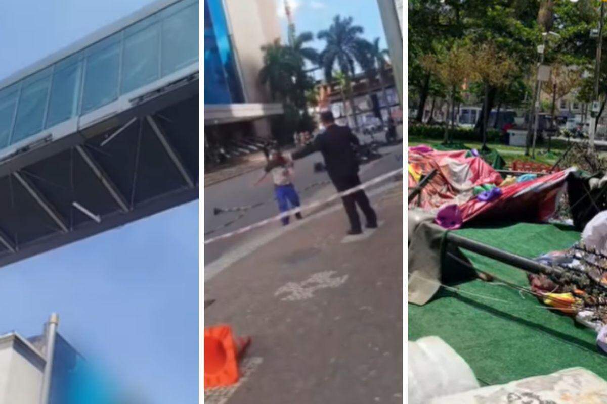 Os destroços bloquearam a calçada; há risco de outra parte da fachada do templo cair