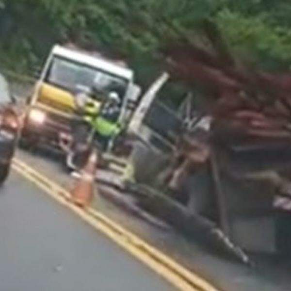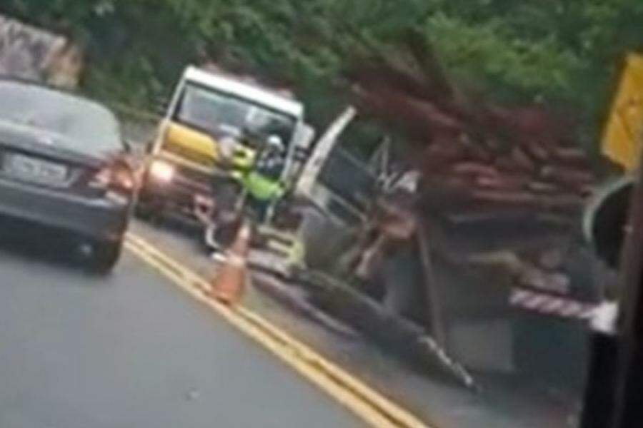 Caminhão colide com outro e derruba carga de madeira na Mogi-Bertioga