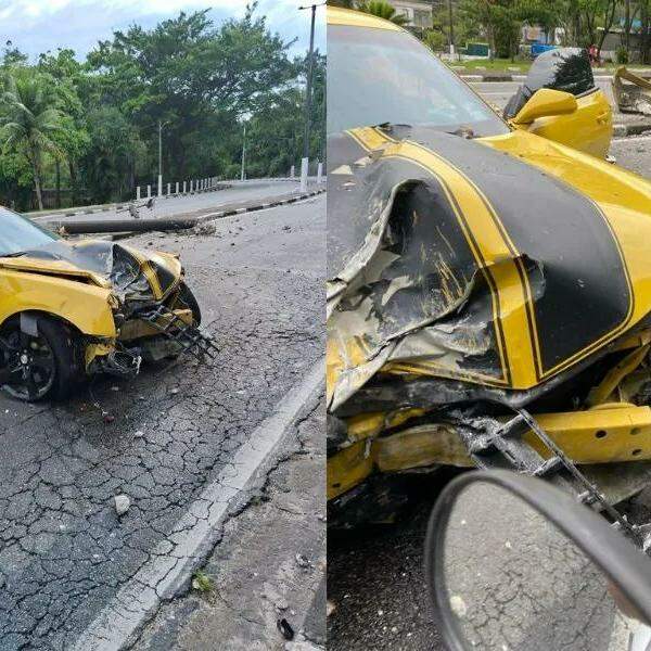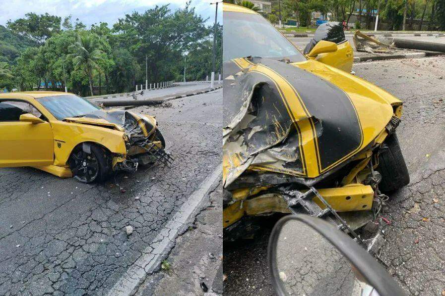 Motorista bate Camaro amarelo em poste e foge do local do acidente no Litoral de SP