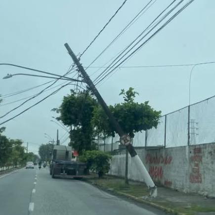 Poste de energia elétrica com risco de queda é denunciado em avenida do litoral de São Paulo