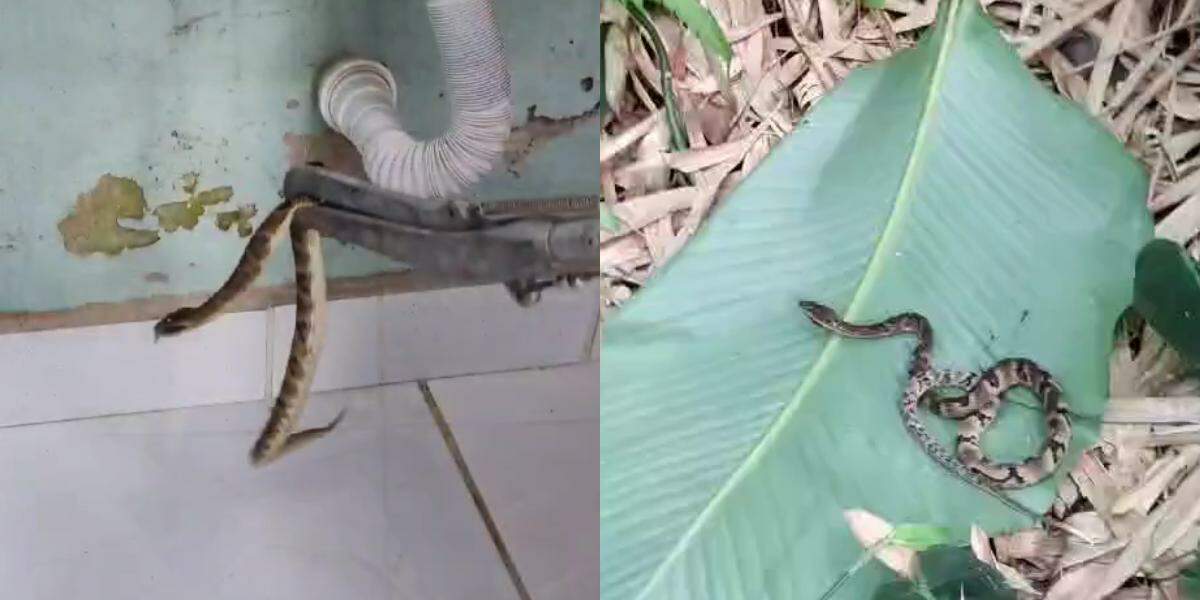 Cobra venenosa surpreende moradores e surge atrás de máquina de lavar no litoral de São Paulo; VÍDEO