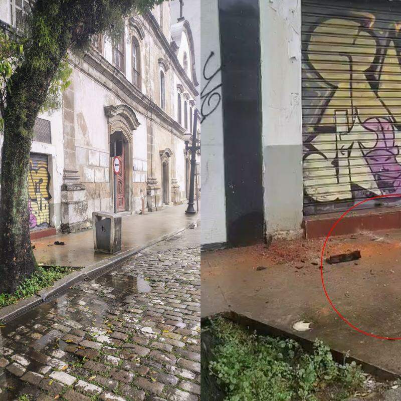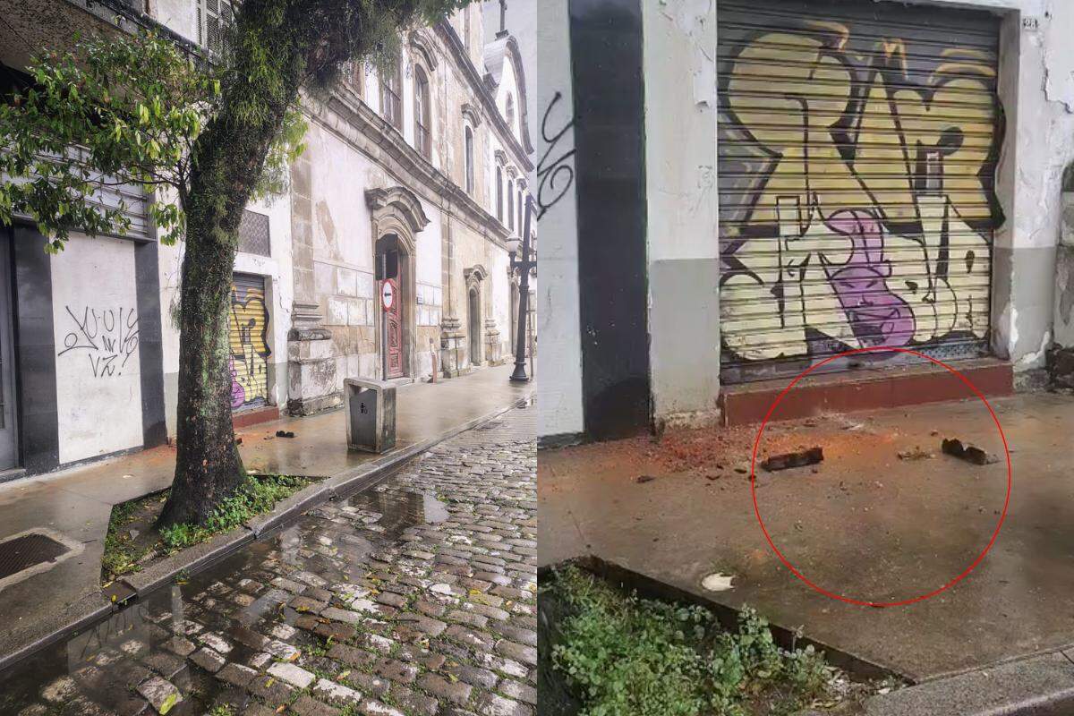 Os destroços bloquearam a calçada; há risco de outra parte da fachada do templo cair
