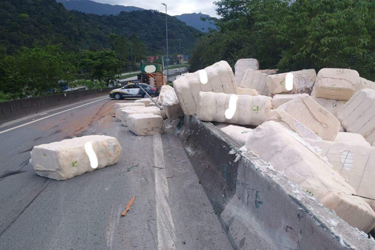 Tombamento de carreta derruba toneladas de algodão em rodovia de Cubatão